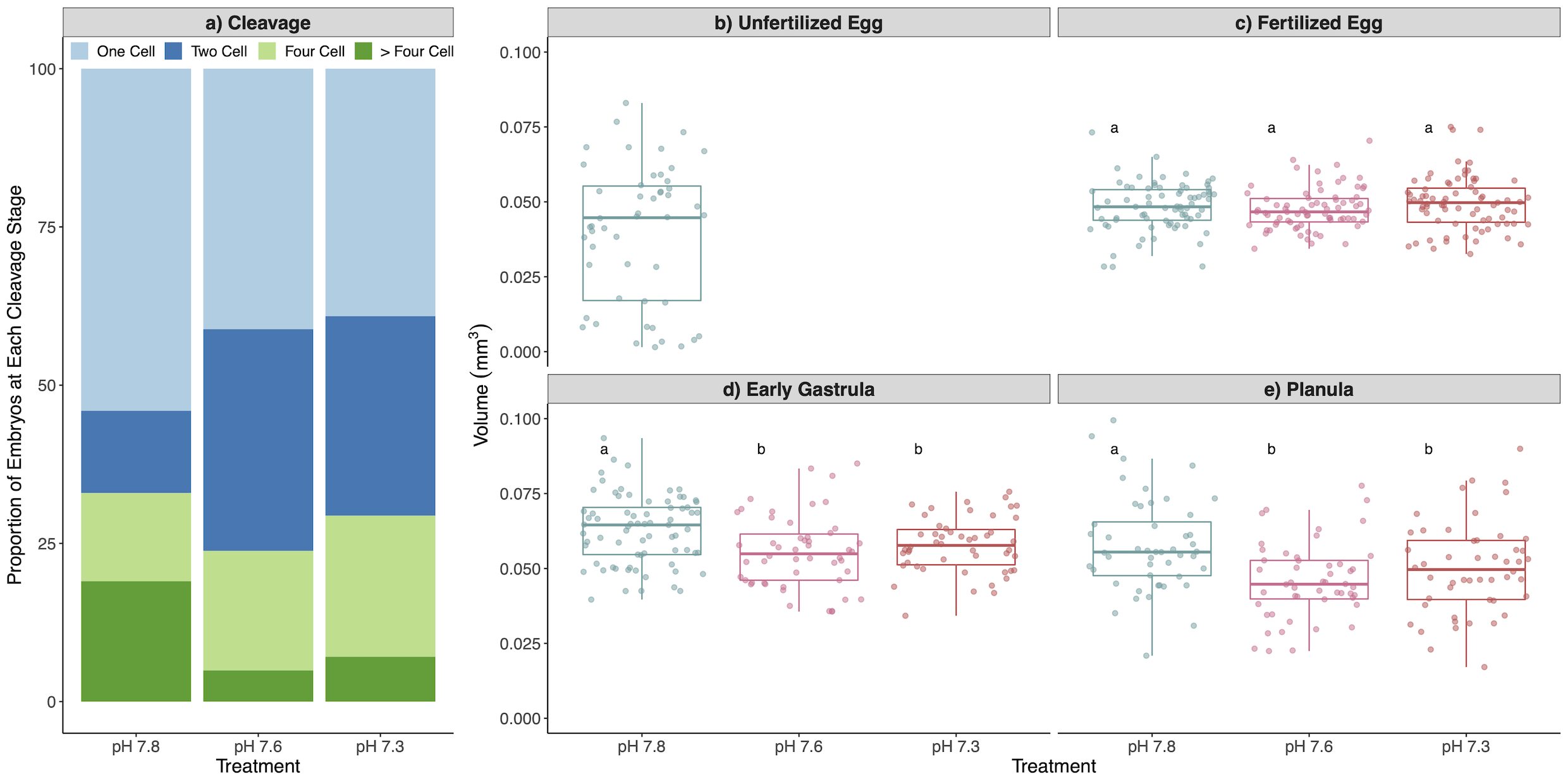 In light of the chronic stress and mass mortality reef-building corals face under climate change, it is critical to understand the processes driving reef persistence and replenishment, including coral reproduction and development. Here, we quantified gene expression and sensitivity to ocean acidification across a set of developmental stages in the rice coral, Montipora capitata. Embryos and swimming larvae were exposed to pH treatments of 7.8 (ambient), 7.6 (low) and 7.3 (extreme low) from fertilization to 9 days post-fertilization. Embryo and larval volume, and stage-specific gene expression were compared between treatments to determine the effects of acidified seawater on early development. Although there was no measurable size differentiation between pH treatments at the fertilized egg and prawn chip (9 h post-fertilization) stages, early gastrulae and larvae raised in reduced pH treatments were significantly smaller than those raised in ambient seawater, suggesting an energetic cost to developing under low pH. However, no differentially expressed genes were found until the swimming larval stage. Notably, gene expression patterns of larvae developing at pH 7.8 and pH 7.3 were more similar than those of larvae developing at pH 7.6. Larvae from pH 7.6 showed upregulation of genes involved in cell division, regulation of transcription, lipid metabolism and response to oxidative stress in comparison to the other two treatments. Although low pH appears to increase energetic demands and trigger oxidative stress in larvae, the developmental process is robust to this at a molecular level, with the swimming larval stage reached in all pH treatments.