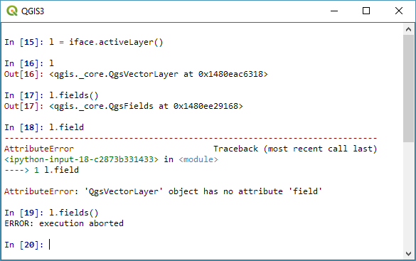 After the attribute error, I only get `ERROR: execution aborted` and have to restart the console to get it working again: