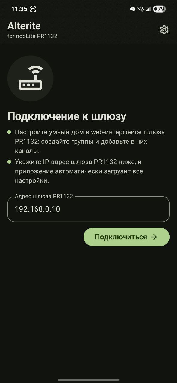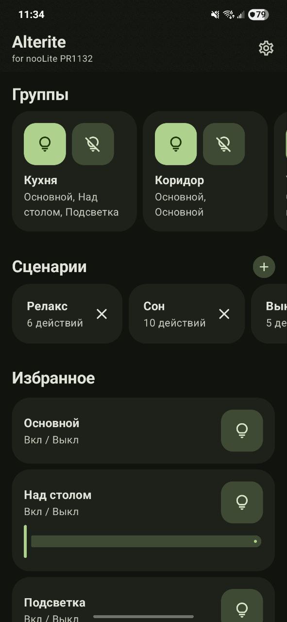 Alterlite — Android-клиент для управления освещением через ethernet-шлюз nooLite PR1132. Альтернатива официальному приложению производителя, с упором на простоту и гибкость сценариев.