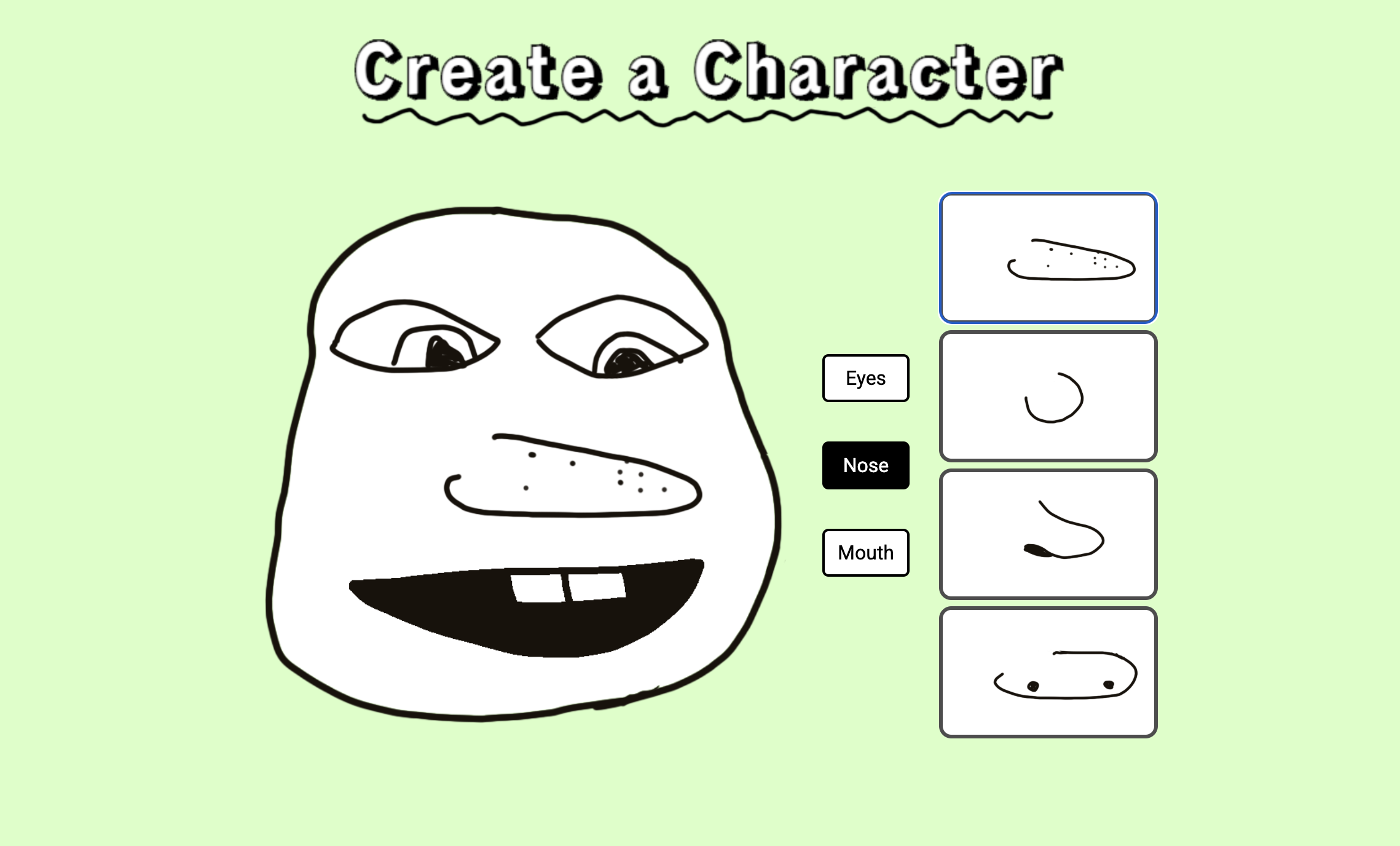 An application to build a character's face in which the user can dynamically change the eyes, nose and mouth. Inspired by some children's books that have this kind of interaction.