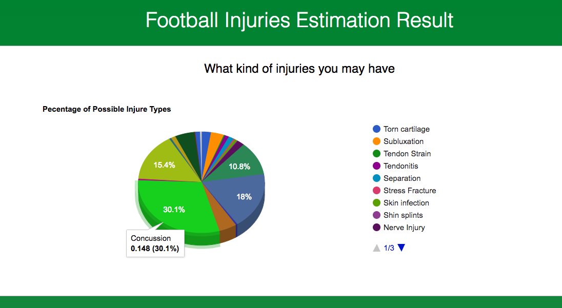 - You will be redirect to the estimation result page with a pie chart that lists the percentage of your injury types.