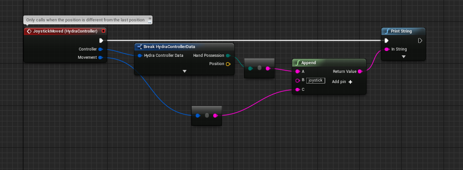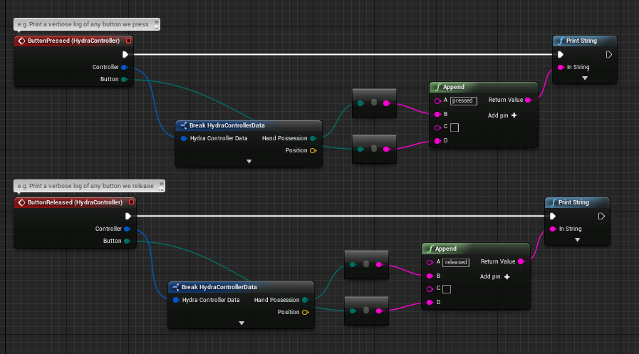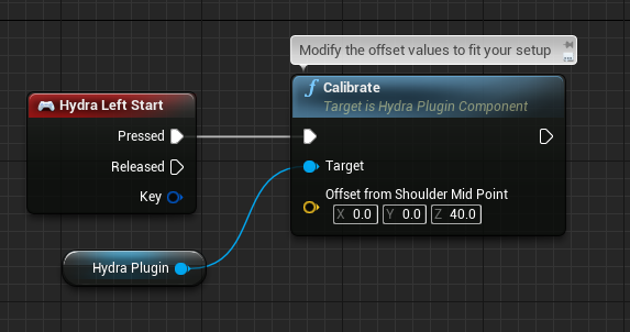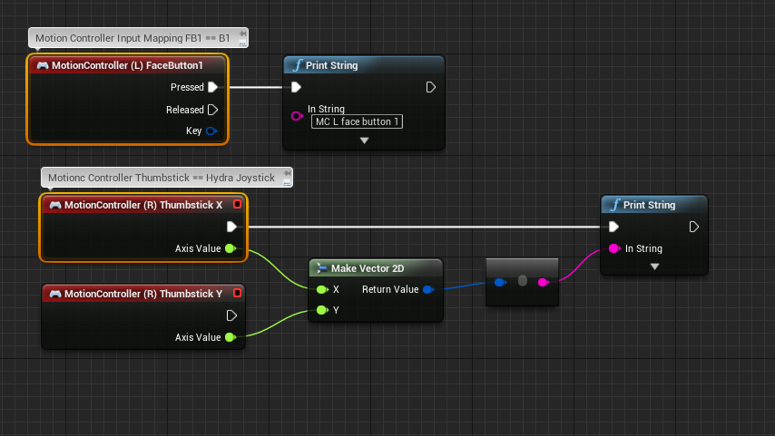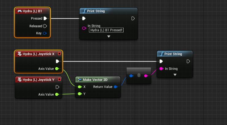 Since version 0.8, the plugin works through both Unreal Engine Motion Controller and Input Mapping abstraction as well as through a convenience component for hydra specific events and functions.