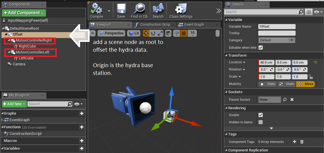 Please refer to the Motion Controller Component Setup unreal documentation as this setup is hardware agnostic. Since 0.9 a basic motion controller setup should look like this: