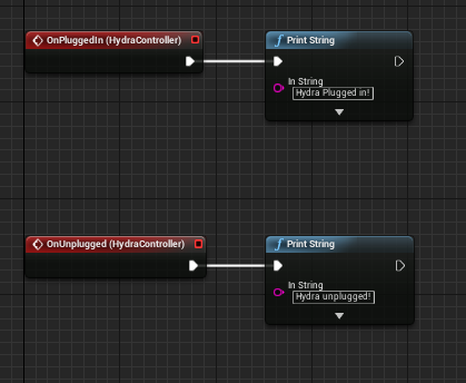 How about events? Now there are no more interfaces to deal with, instead you click on your hydra plugin component and click the green + to add the event from the details pane. This should feel familiar as these are the same blueprint assignable multicast delegates that PrimitiveComponents use for collision checks (e.g. OnBeginOverlap)