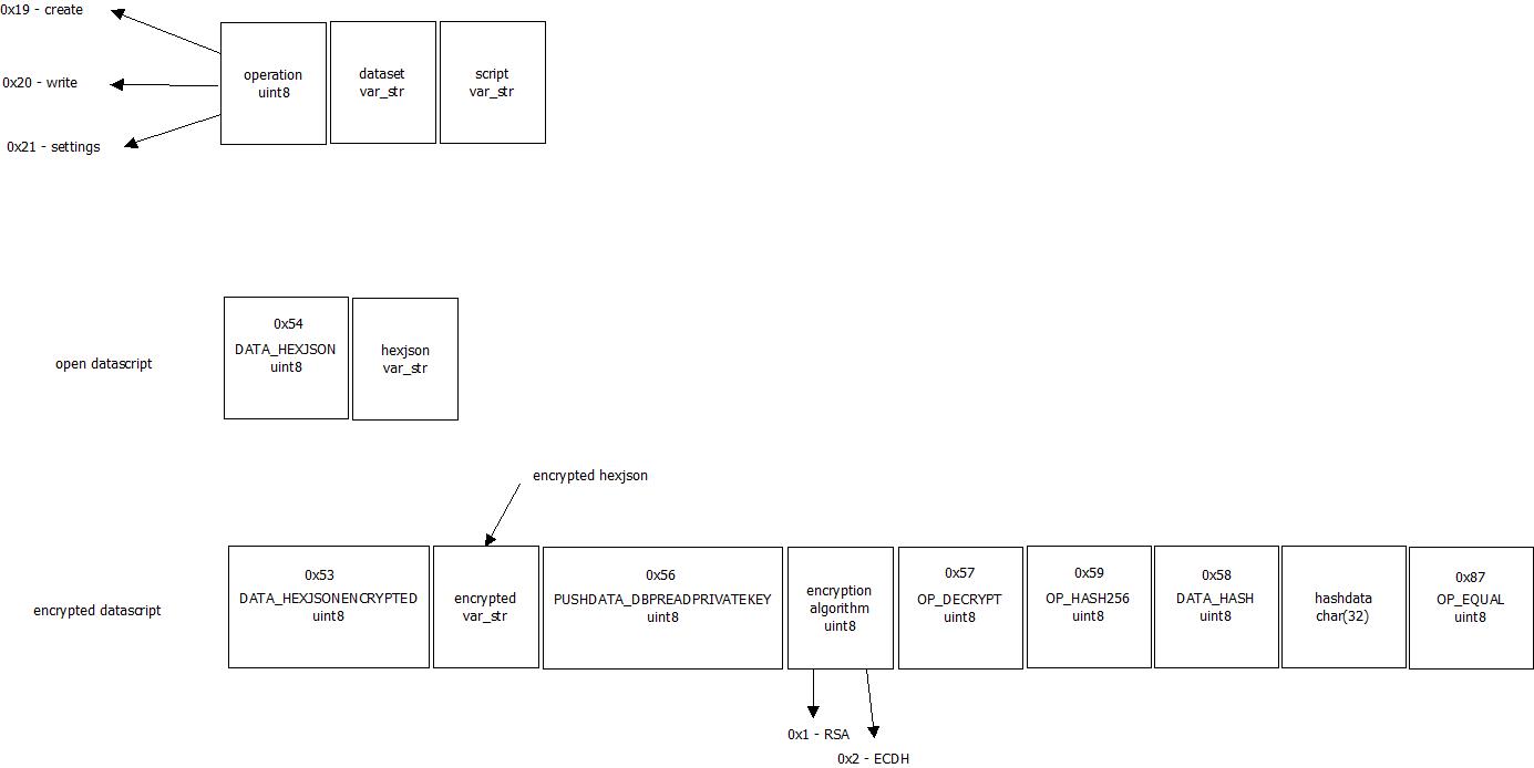 Datascript can be encrypted and open. Datascript its a script system, stack-based and processed from left to right. It is purposefully not Turing-complete, with no loops. Look like bitcoin script and support some operations from bitcoin. Full list of operators:
