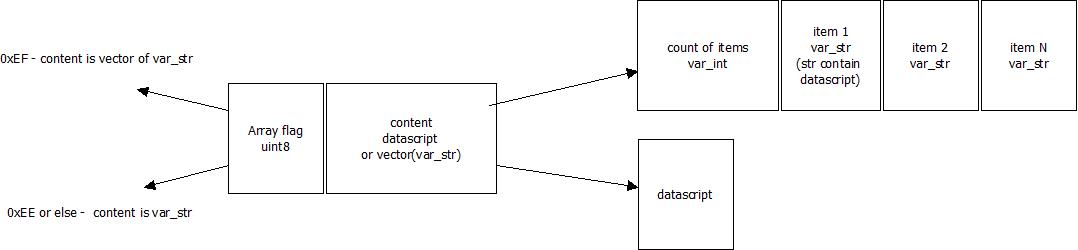 first byte of datascript level its op_flag, that contain type of datascript. In version 0.0.1 supported operation is create (0x19), settings (0x21), write (0x20). After first byte - var_str dataset name, and after that - var_str datascript.