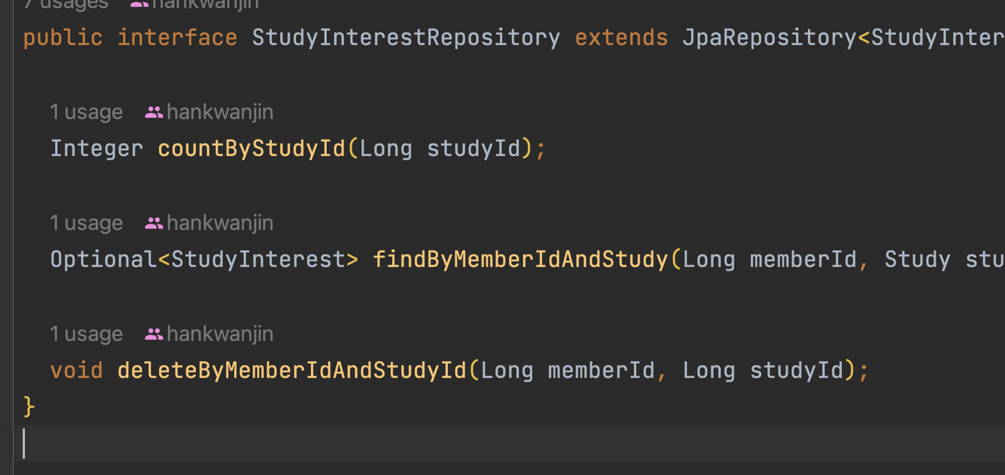 저희 StudyInterestRepository 코드를 예시로 들겠습니다. StudyInterest는 스터디와 좋아요의 관계를 나타내는 중간 테이블입니다. 이 안에는 Study, Interest 둘의 외래키를 가지고 있습니다. 해당 사진에 있는 메소드들은 아래와 같은 네이밍 규칙을 적용해서 수정이 필요합니다.