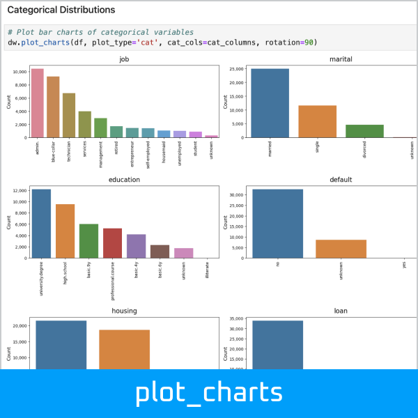 >>> dw.plot_charts(df, plot_type='cat', cat_cols=cat_columns, rotation=90)