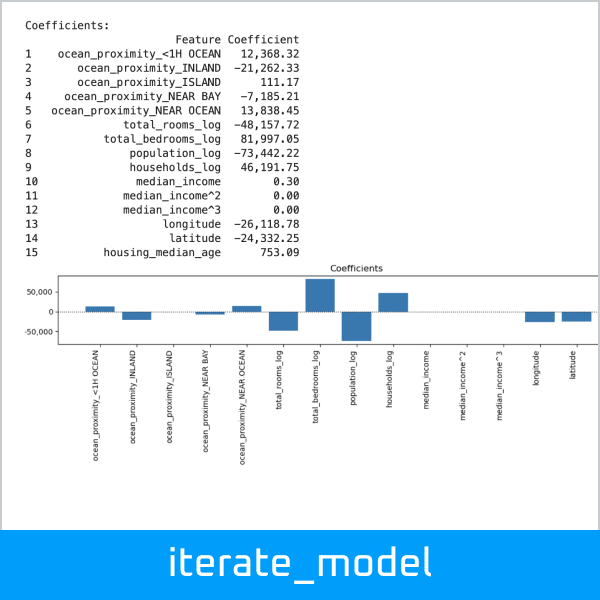 Run a regression model iteration, which dynamically assembles a pipeline and evaluates the model, including charts of residuals, predicted vs. actual, and coefficients: