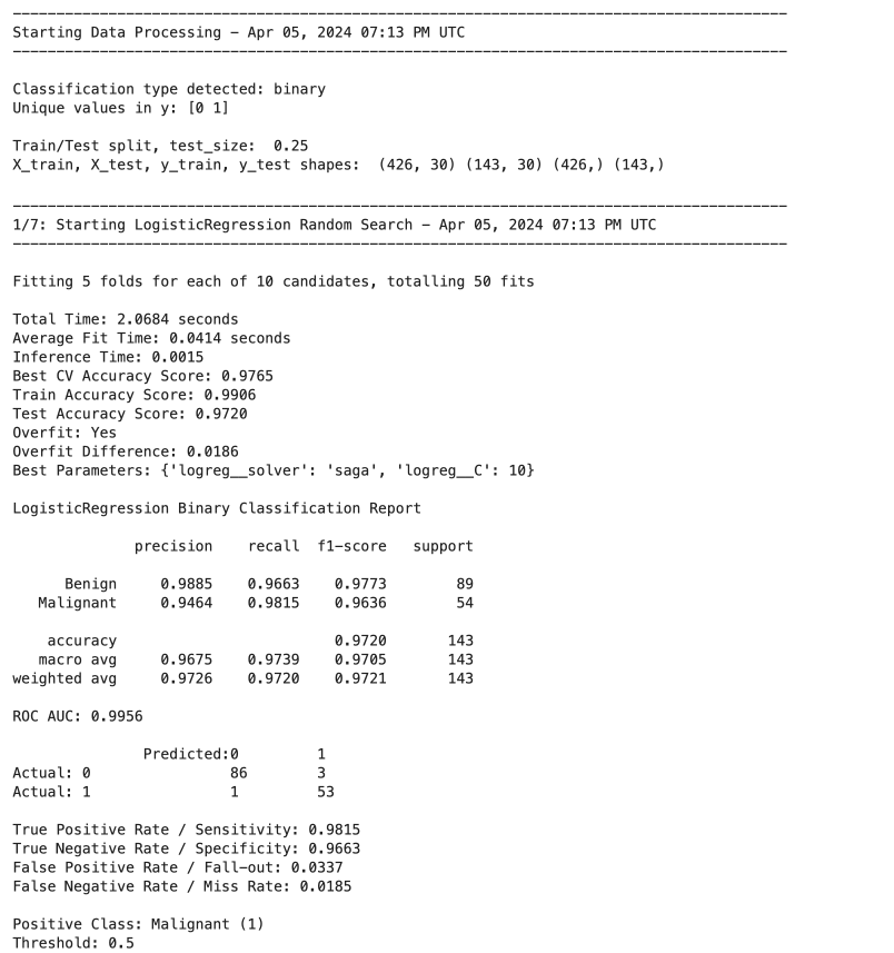 Run a binary classification on 7 models, dynamically assembling the pipeline and performing a grid search of the hyper-parameters, all based on the configuration file defined above: