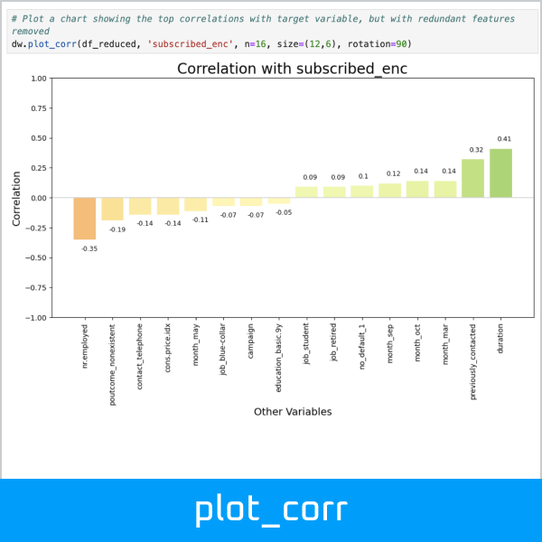 >>> pos_features, neg_features = dw.get_corr(df_enc, n=10, var='subscribed_enc', return_arrays=True)