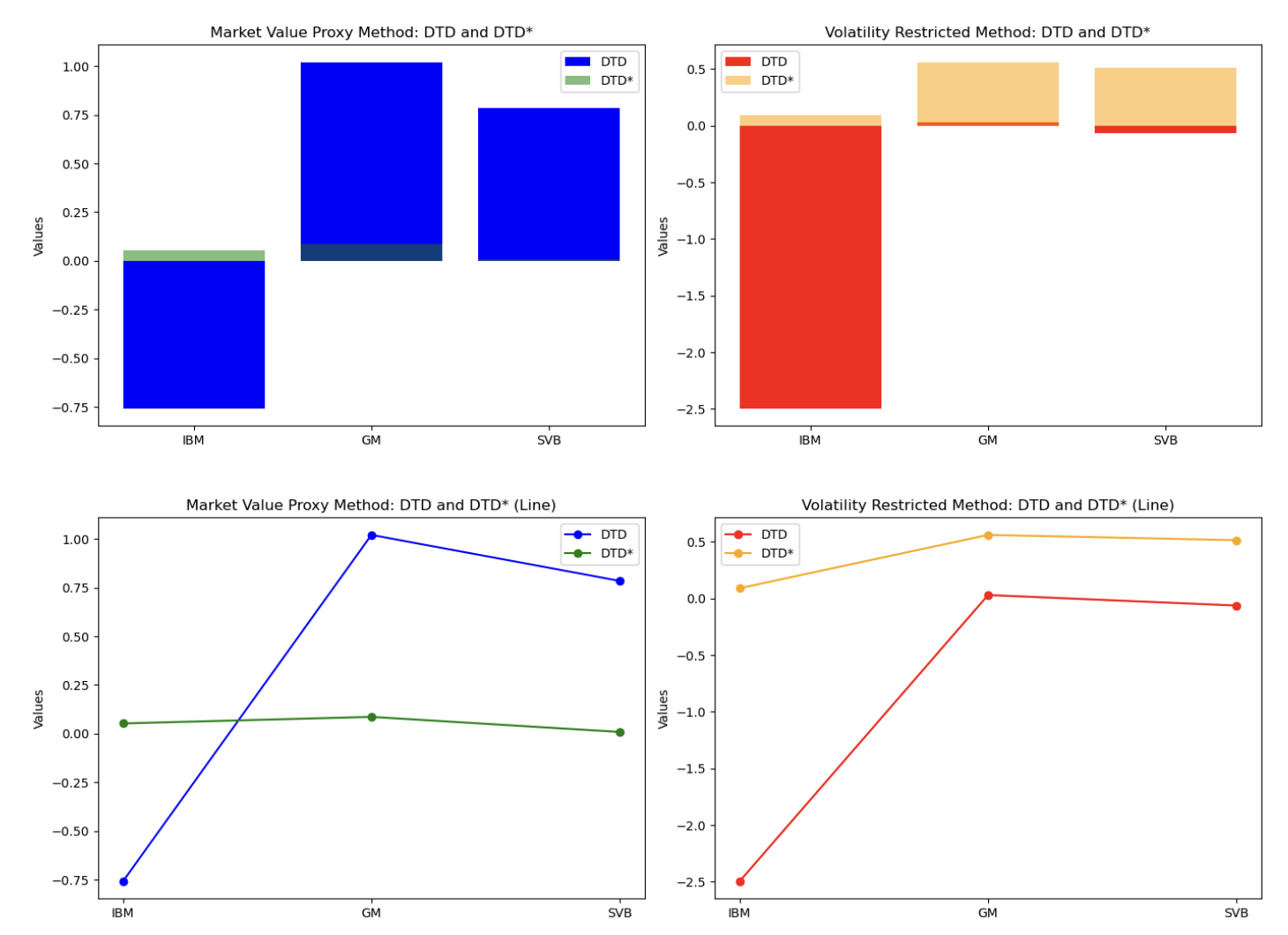SVB also displays a positive DTD of 0.7845 with a very low DTD∗ of 0.0090, suggesting that while the risk of default is less imminent than IBM, the asset value’s volatility is minimal, indicating stability.