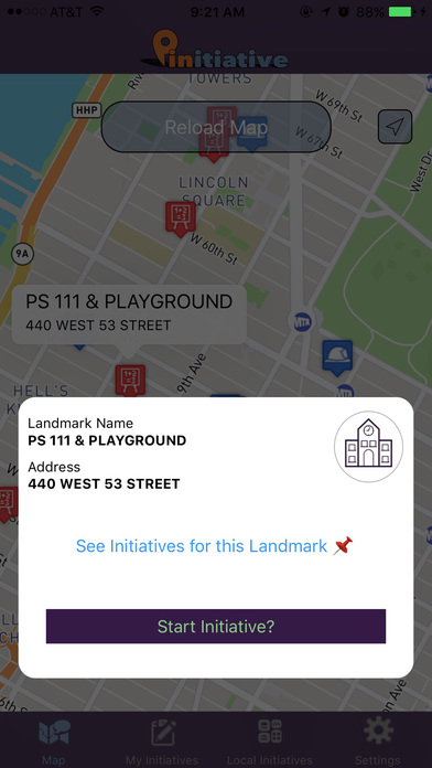 First time users of "Pinitiative" will log in and be brought to a map screen which shows the local landmarks in their area. These landmarks include schools, parks, hospitals, police stations, and firestations. Users can click on a landmark and create an "initiative" about something they care about. They alternatively, can long-click on the map to create an initiative anywhere on the map.