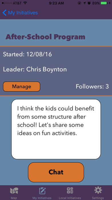 Other users will be able to see your initiatives and nearby initiatives. If they're interested, they can join and use the chat functionality to begin and organize your social change!