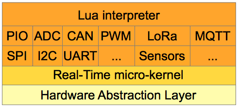 In the top layer there is a Lua 5.3.4 interpreter which offers to the programmer all resources provided by Lua 5.3.4 programming language, plus special modules for access the hardware (PIO, ADC, I2C, RTC, etc ...) and middleware services provided by Lua RTOS (LoRa WAN, MQTT, ...).