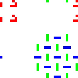- Reproduction: A dead cell with three neighbours of the same class and one empty neighbour becomes a living cell of the same class.