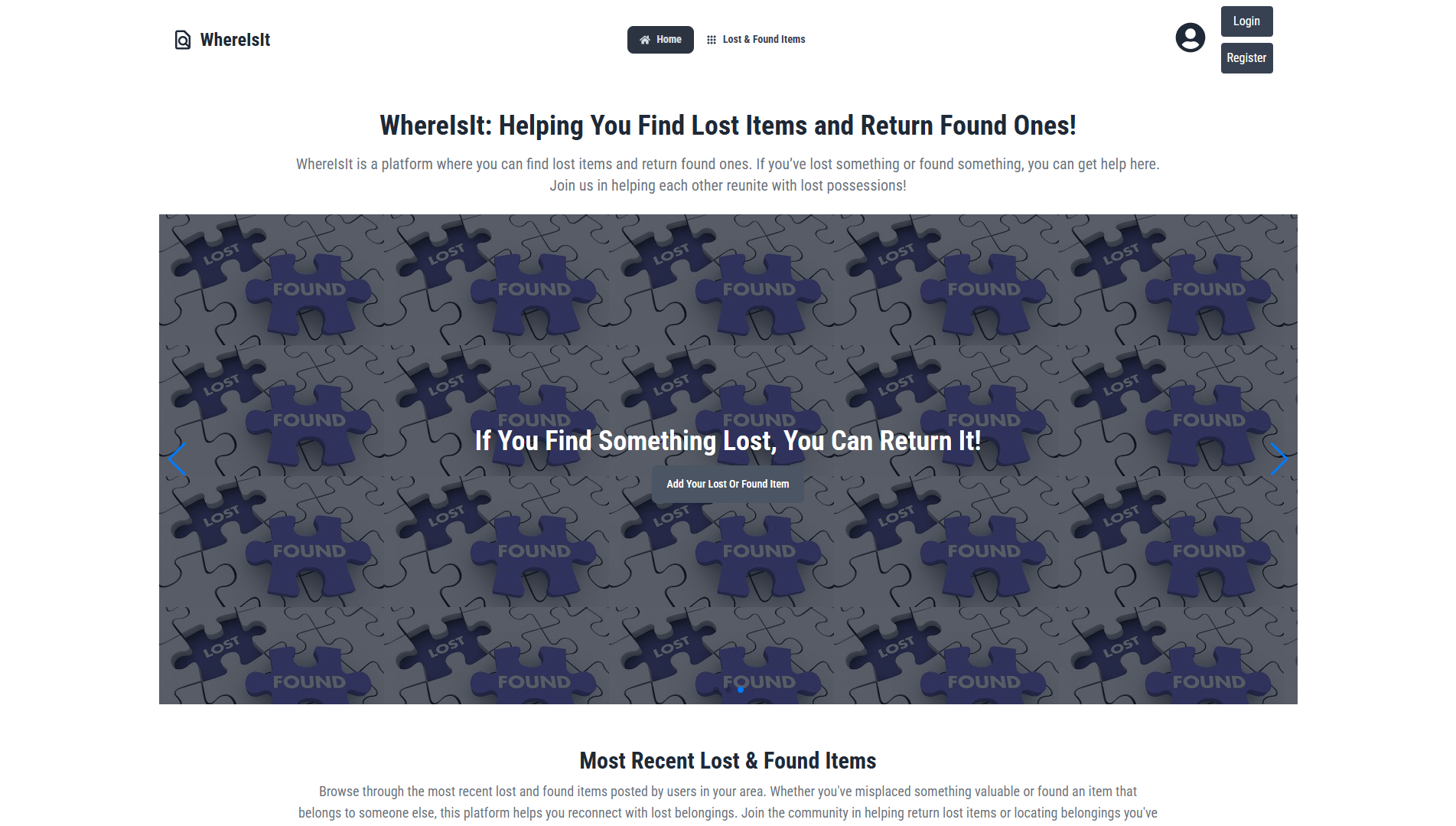 - Home Section β Displays a slider and recent lost & found posts.