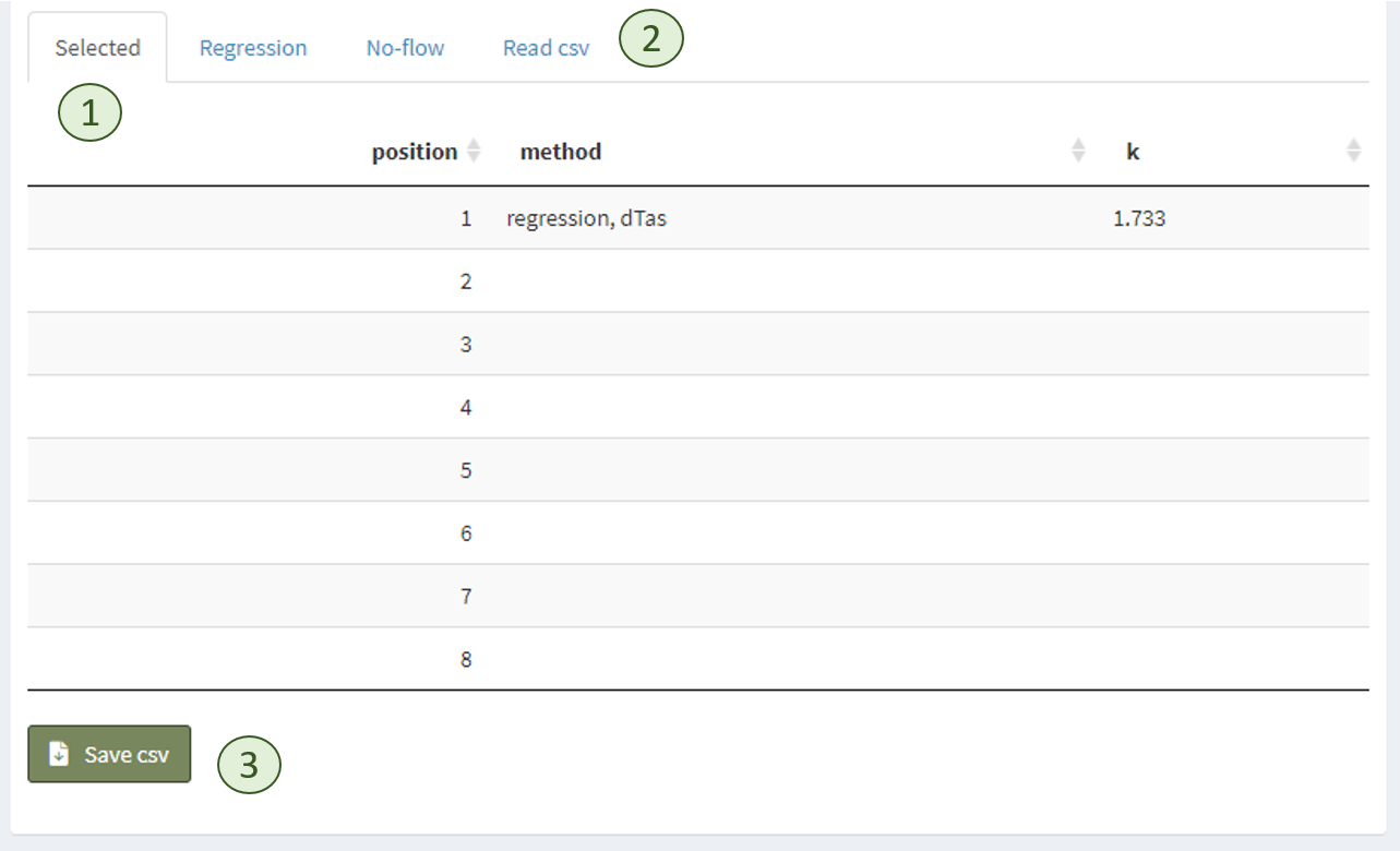 All set K values will appear in the table ‘Selected’ (<1>). The other tables (<2>) provide estimation for all thermometer positions at once obtained with each method. All regression options (figure above <3>) apply to this table, too. If the values of this tables are sufficient, they can all be set at once by clicking ‘Use k-values’ below the table. If K values are provided in a csv-file, the file can be uploaded in the ‘Read csv’ tab (<2>). Selected K values can also be exported as data files (<3>).