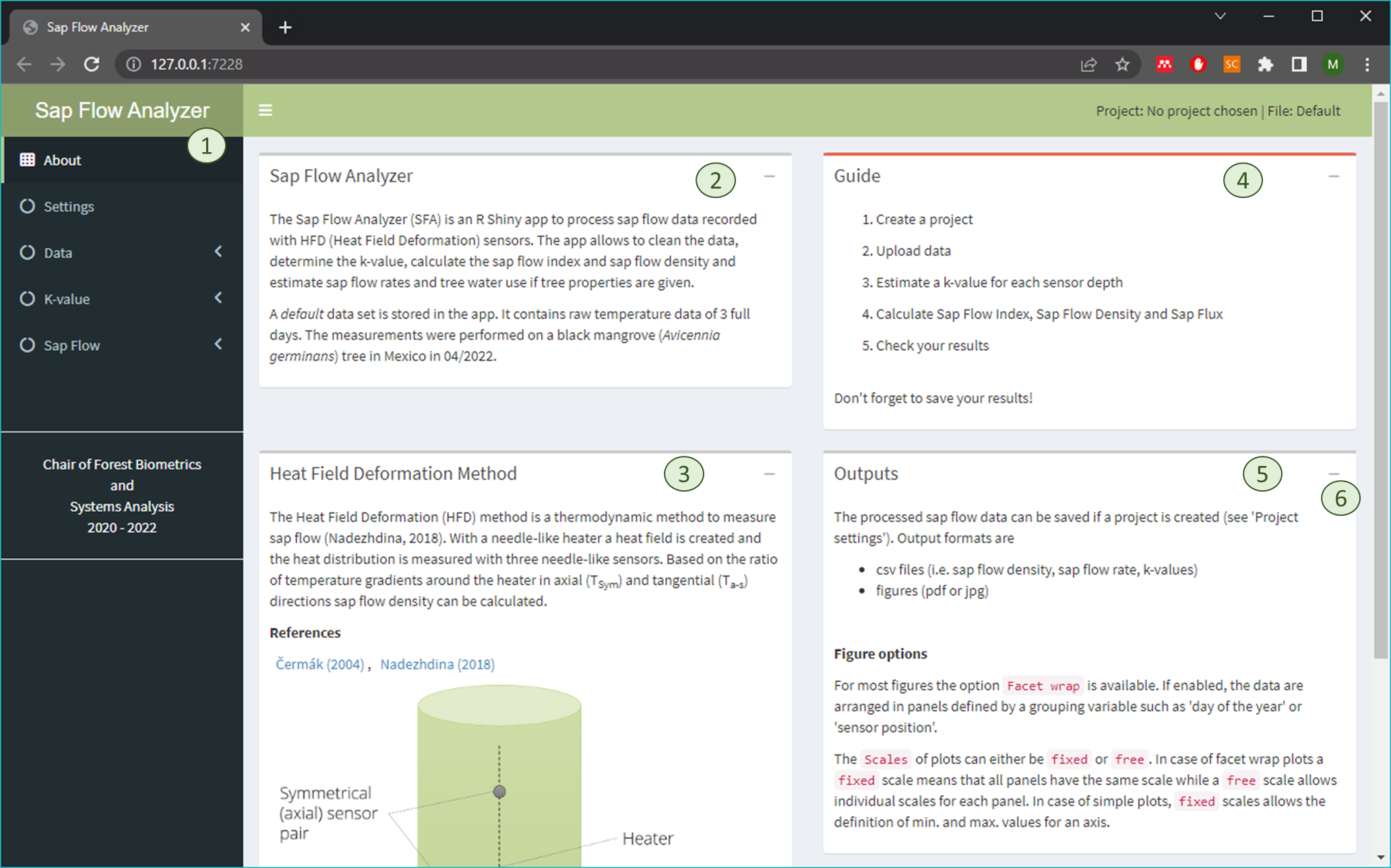 This document describes the handling of the R Shiny Application SapFlowAnalyzer (SFA) to analyze heat field deformation (HFD) sap flow data. Chapters 1 and 2 provide a quick overview of the SFA, while the following chapters provide detailed information on each item of the navigation bar.