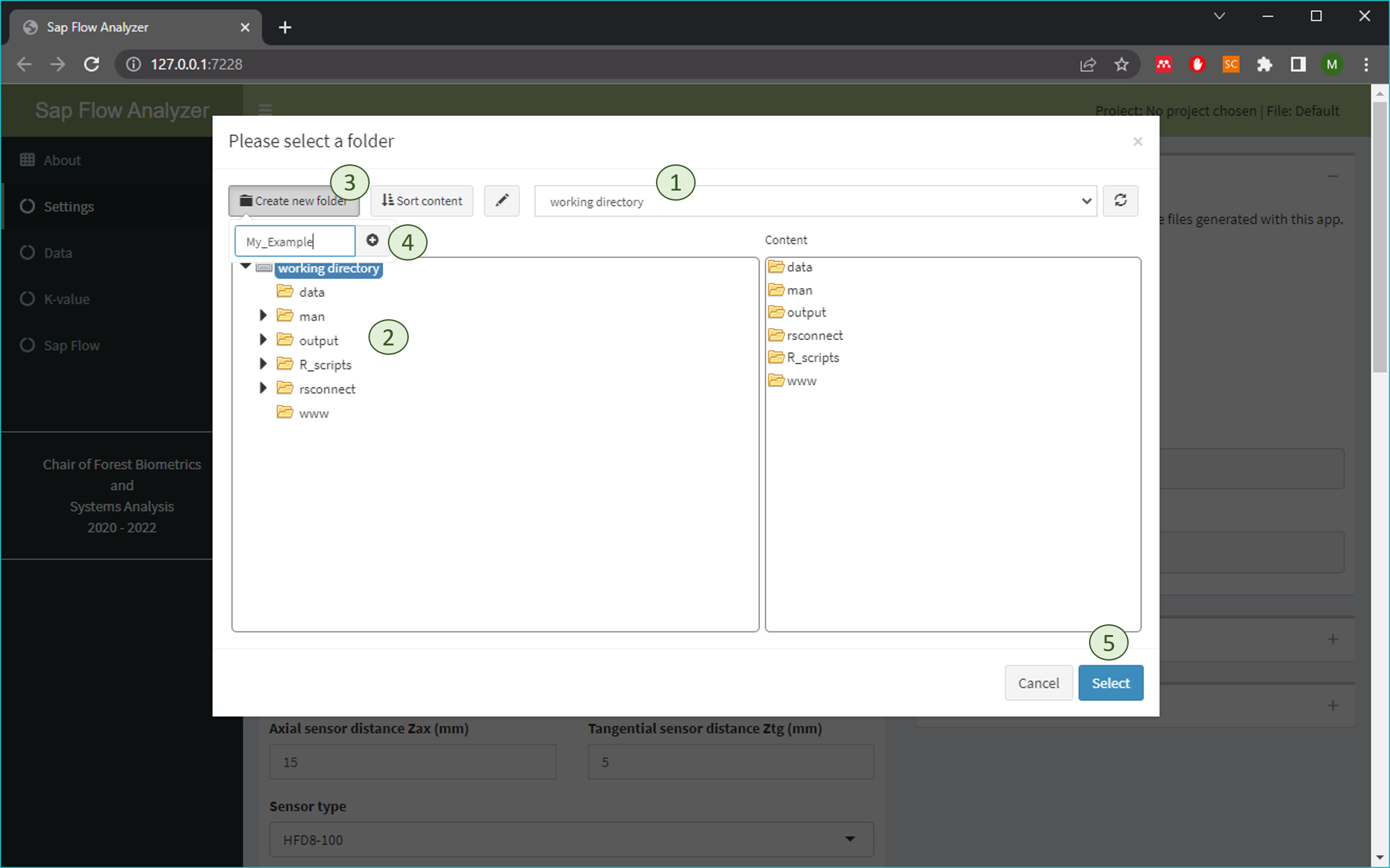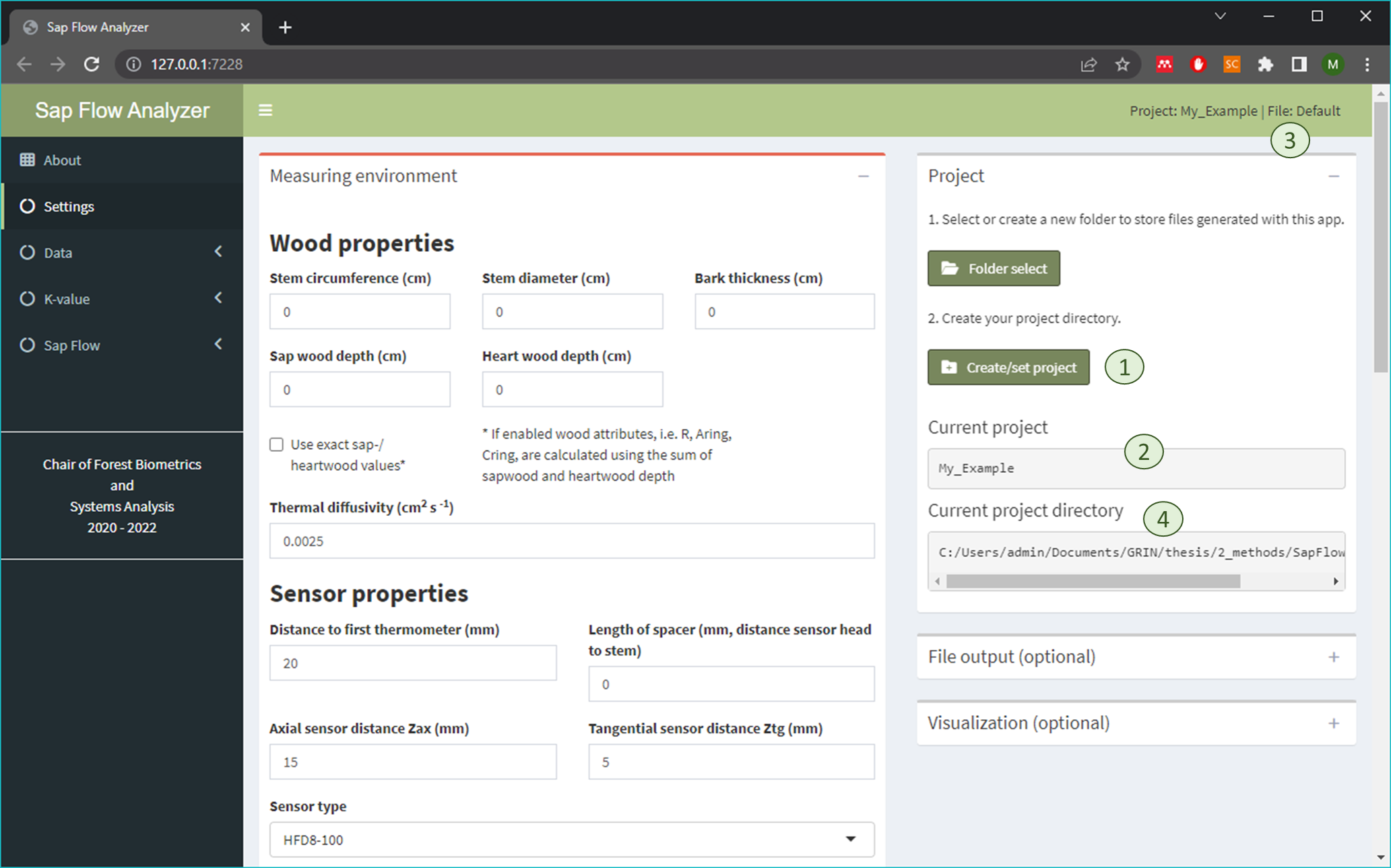 After selecting a project destination folder, press ‘Create/set project’ (<1>). The app automatically creates two subdirectories: ‘graphics’ and ‘csv-files’, where all the processed files are stored in. If no project is created, all results (csv-files and graphics) are saved in the root directory of the app, which might be in the temporary data. If the project was created successfully, the project name is shown in the upper right corner of the SFA <3>. The path to the project directory is shown in <4>. If no project was created, the path to the root directory is shown.