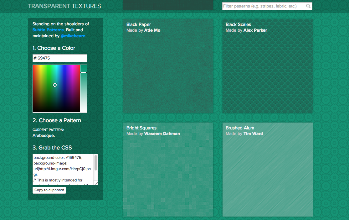 This is the repository for transparenttextures.com. The mission of Transparent Textures is to extend the utility of Subtle Patterns by adding transparency to all of the patterns, allowing them to be used with any CSS background-color.