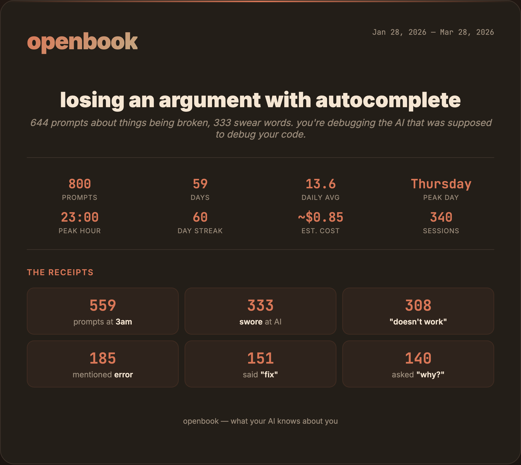 - The receipts — how many times you swore, said "fix", coded at 3am