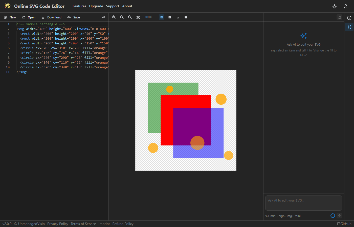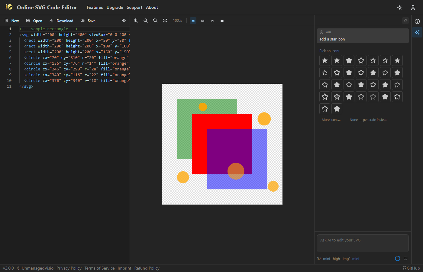 An SVG code editor with AI assistance, schema-aware autocomplete, and live preview.