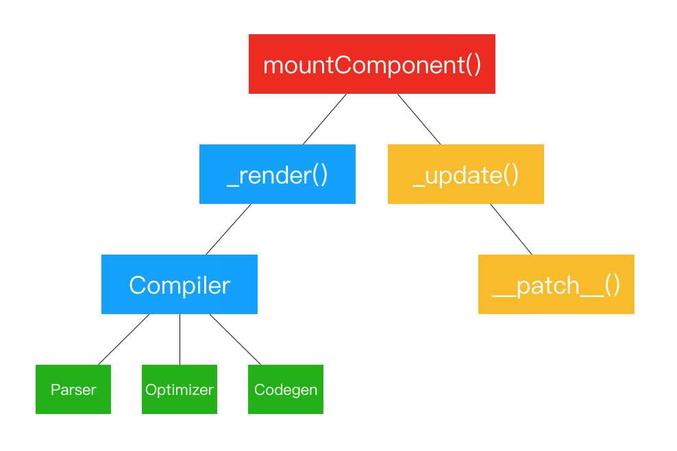 vm.__patch__() is the key part. If this is a new node, it will initialize the DOM, otherwise, it will update the DOM. Both are implemented inside vm.__patch__() with the VNodes we got from render().