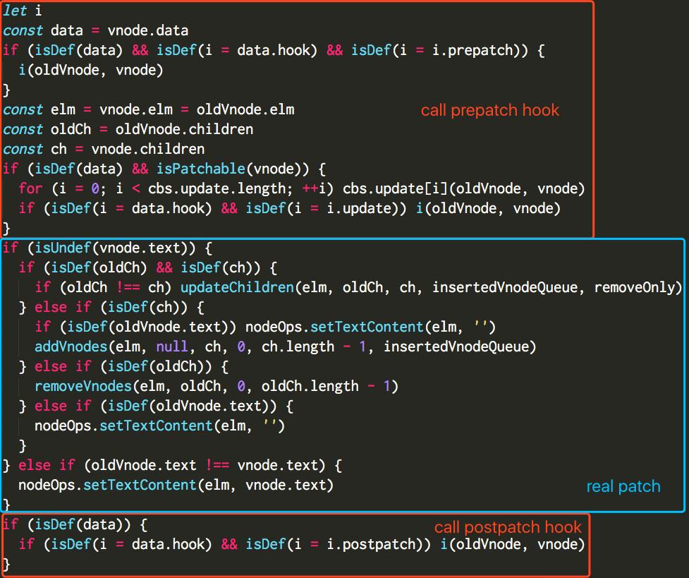 The outmost if clause checks if vnode has text. If it has, then it must be a leaf node, and if the text changes, just call nodeOps.setTextContent().