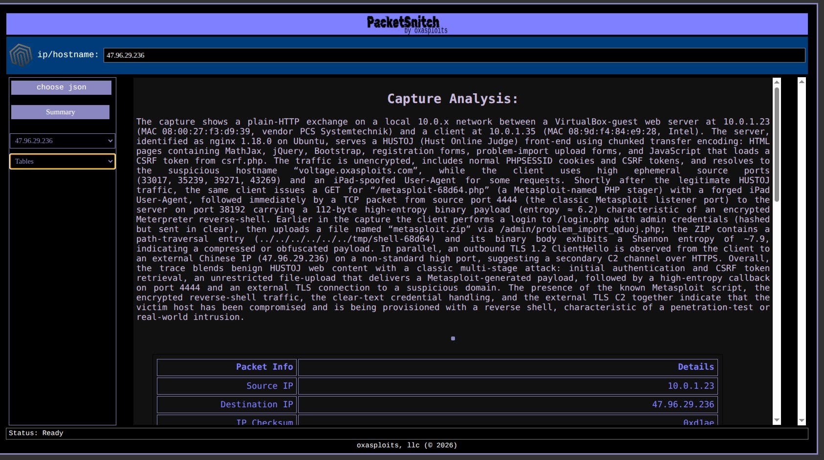 PacketSnitch is a Python tool for extracting payloads and rich metadata from network packet capture (.pcap) files. It generates testcases for fuzzing, protocol analysis, and research by saving raw packet data and detailed information about each packet, including protocol, entropy, geoip, banners, and more. The tool optionally performs active reconnaissance to enrich output with server banners, SSL certificate info, and web page titles.