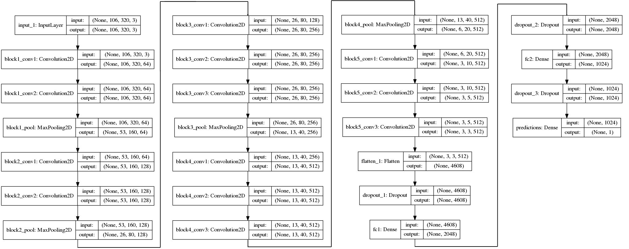 For this project a technique called transfer learning was used to reuse a pretrained model for a different task. In this case the model used is the VGG16 from the Visual Geometry Group trained on the imagenet dataset. Since the initial problem the model was trained on is quite different from the problem at hand the last block was removed, rebuild with slightly different parameters and retrained. Instead of three convolution layers with no followed by a Max pooling layer, three convolution layer with sub sampling and no pooling layer are used. The top layer was build from scratch to be able to predict contentious values instead of classes.