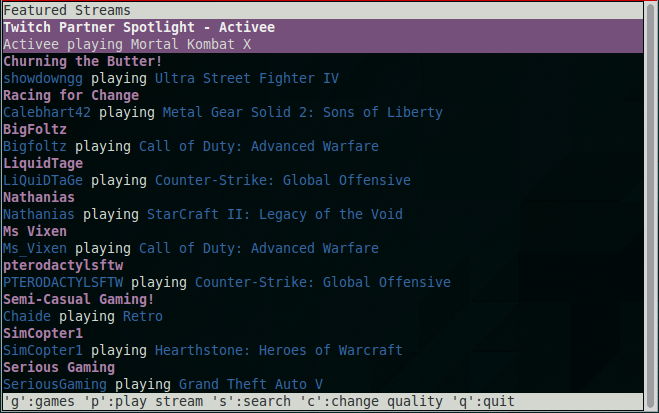 A simple terminal tool for browsing Twitch.tv and watching streams on VLC Player using Livestreamer.