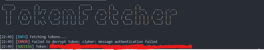 [ERROR] Failed to decrypt token: cipher: message authentication failed, this is normal for some tokens. Discord stores multiple tokens, and only valid ones will be decrypted successfully. - If the application closes instantly make sure to run it using the cmd/powershell