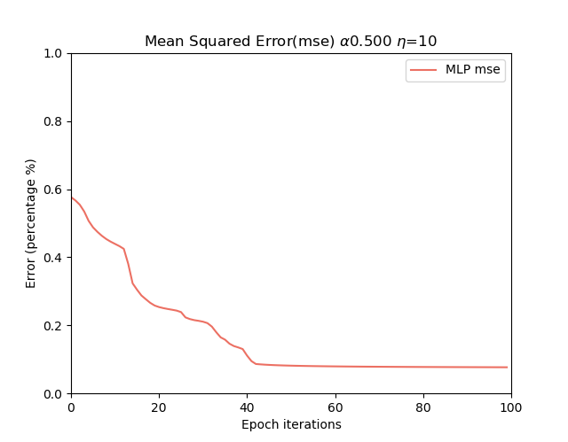 During the discovery of this network's behavior one very important hyper parameter that must be taking into account is the learning rate. As the back-propagation works by taking the derivative of the activation function to find the steepest decent of the loss function (activation function). The final step is to relay that error into the networks weights to readjust the neurons to the correct locations in the input space.