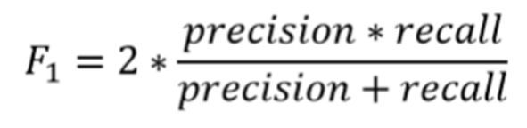학습이 잘 되었는지, 결과를 평가하기 위해 f1-score을 사용하였다. accuracy와 loss 값만으로 결과의 성능을 예측하기에는 데이터의 특성상 데이터 불균형이 심하기 때문에 추가적인 평가 지표가 필요하였다. f1-score을 구하기 위해선 precision, recall 값이 필요하다. precision(정밀도)란, 모델이 true라고 분류한 것 중에서 실제 true인 것의 비율을 뜻한다. recall(재현율)이란, 실제 true인 것 중에서 모델이 true라고 예측한 비율을 뜻한다. 최종적으로 f1-score은 다음과 같이 구할 수 있다.