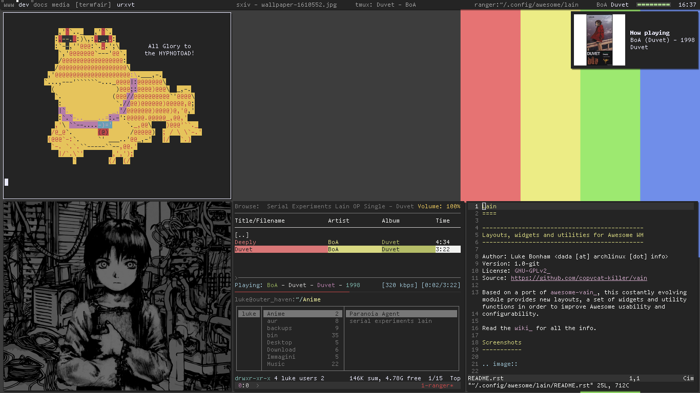 Successor of awesome-vain, this module provides new layouts, a set of widgets and utility functions, in order to improve Awesome usability and configurability.