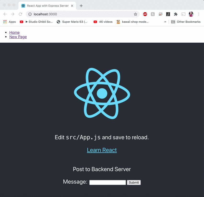 POSTroute returns "POST request received! This is the message that was sent: [user input]". When submitting the form found on the homepage of the app, React calls the Express.jsPOSTroute and displays the message. - The app also has client side routing using the React Router, which navigates the user to a