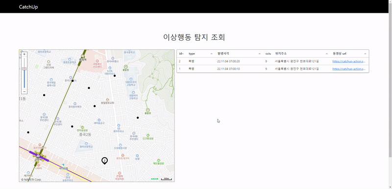 - 이상행동의 발생위치를 알 수 있는 지도와 이상행동에 대한 정보를 담고 있는 테이블로 구성되었습니다.