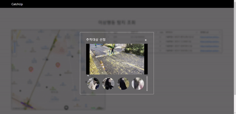 - 마커를 클릭하면 이상행동에 대한 CCTV 영상을 확인하고 추적대상을 선택할 수 있습니다.