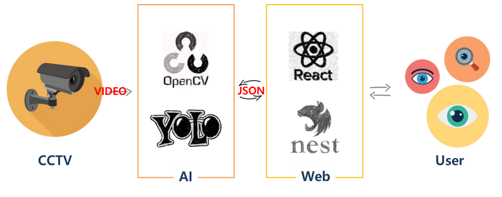 CCTV 영상 분석을 통해 이상행동을 감지하고 다른 CCTV에서 동일인물인지 판단하는 AI 파트와 소켓통신을 통해 실시간으로 AI 서비스를 지도 뷰로 제공하는 Web 파트로 구성되어 있습니다.