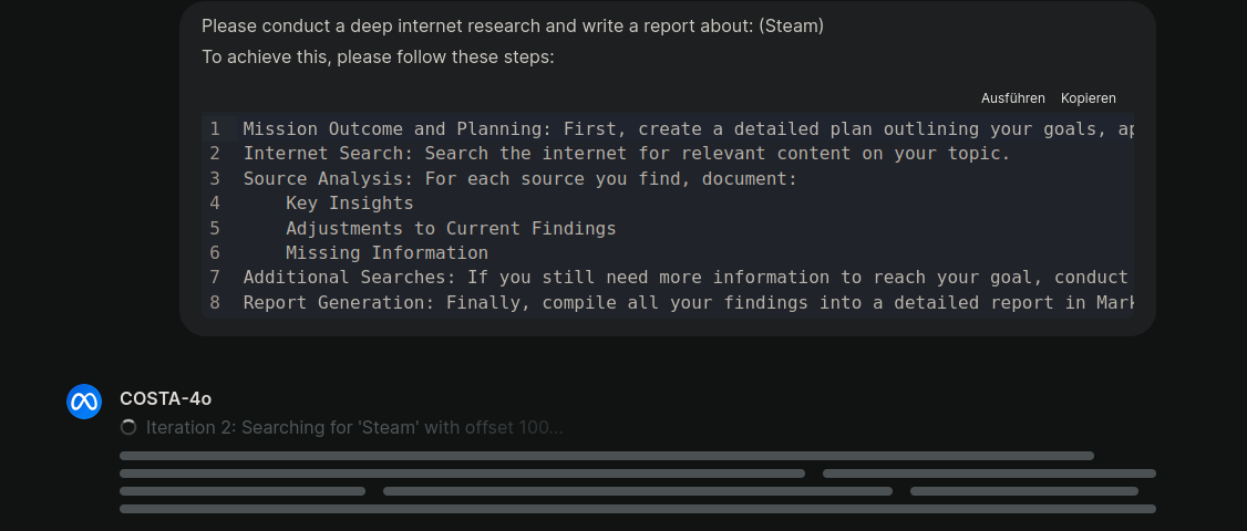 This project implements an asynchronous deep research tool that performs iterative internet searches using a SearXNG-compatible endpoint. It processes search results by scraping the content of the returned pages with BeautifulSoup, refines the search query if too few results are obtained, and finally generates a comprehensive Markdown report. Throughout the search process, status updates and citation events are sent to a frontend via a callback function.