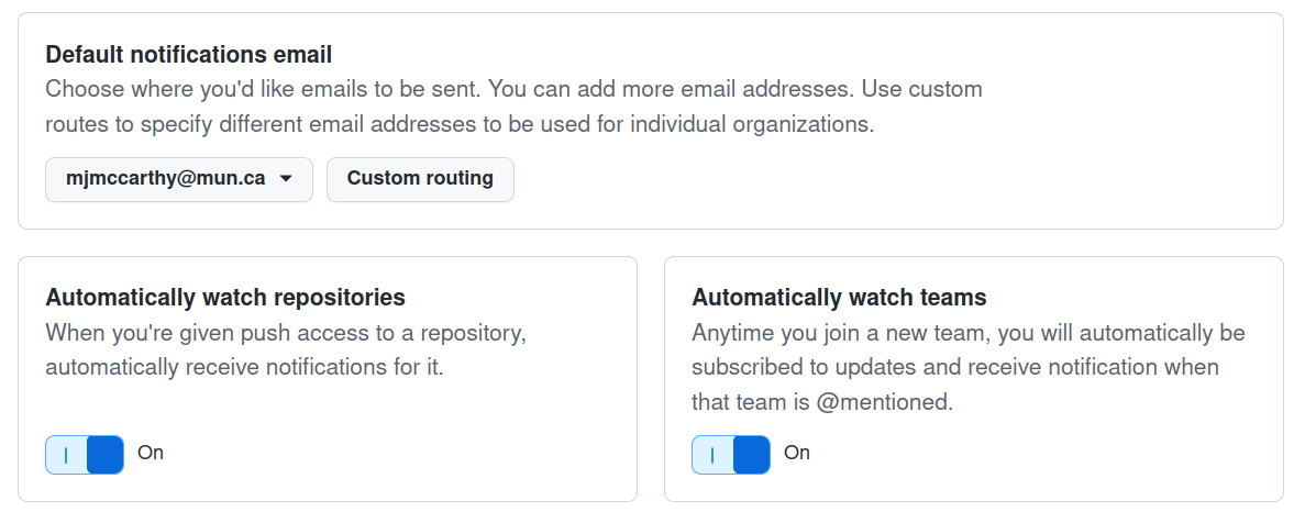 Using [Configuring Notifications Tutorial](https://docs.github.com/en/account-and-profile/managing-subscriptions-and-notifications-on-github/setting-up-notifications/configuring-notifications#choosing-your-notification-settings) Set up email notifications.