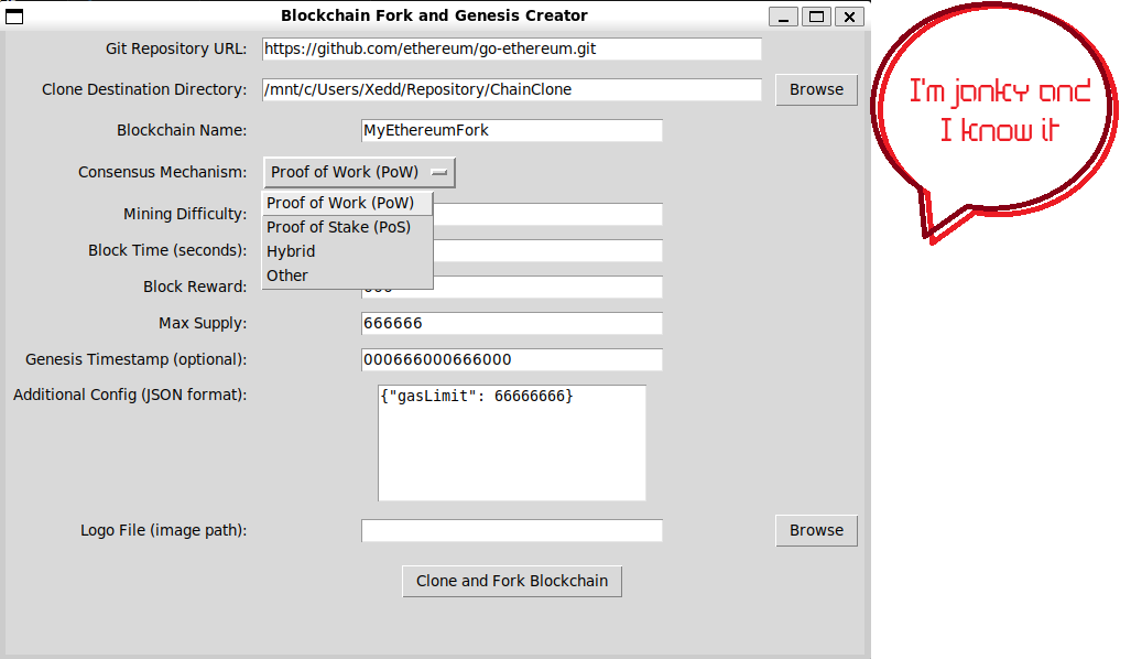 My Janky tkinter based gui attempt for cloning ethereum @ the last PoW commit and modifying basic parameters like genesis, consensus, difficulty, reward, logos, etc. Don't expect this to work well--that's why it's called slapblock--it's slapped together.