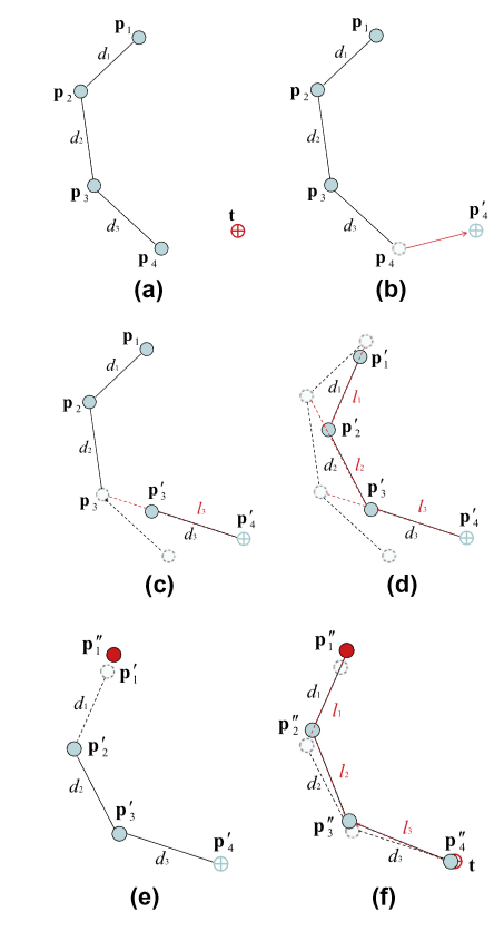 If the entire bone chain is guaranteed to be within reach, then the FABRIK process can begin. The whole is divided into two steps. First, start the calculation from the end bone, and first move the endmost bone p4p4 to the target position t. At this time, the position of the bone p4p4 is p′4p4′.
