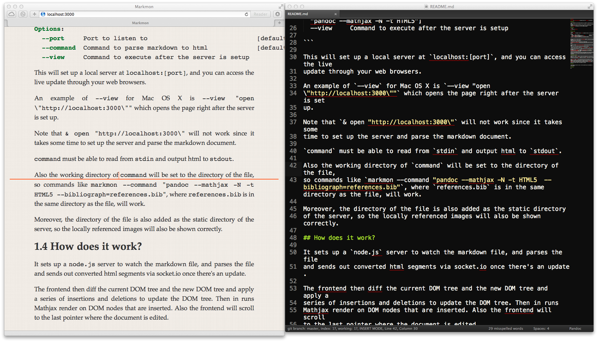 It sets up a node.js server to watch the markdown file, and parses the file